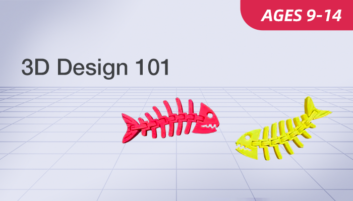 3D Design 101 is a beginner 3D design course for 9-14-year-olds, using Tinkercad to learn basic 3D modeling and create various creative 3D works from boxes to dioramas.